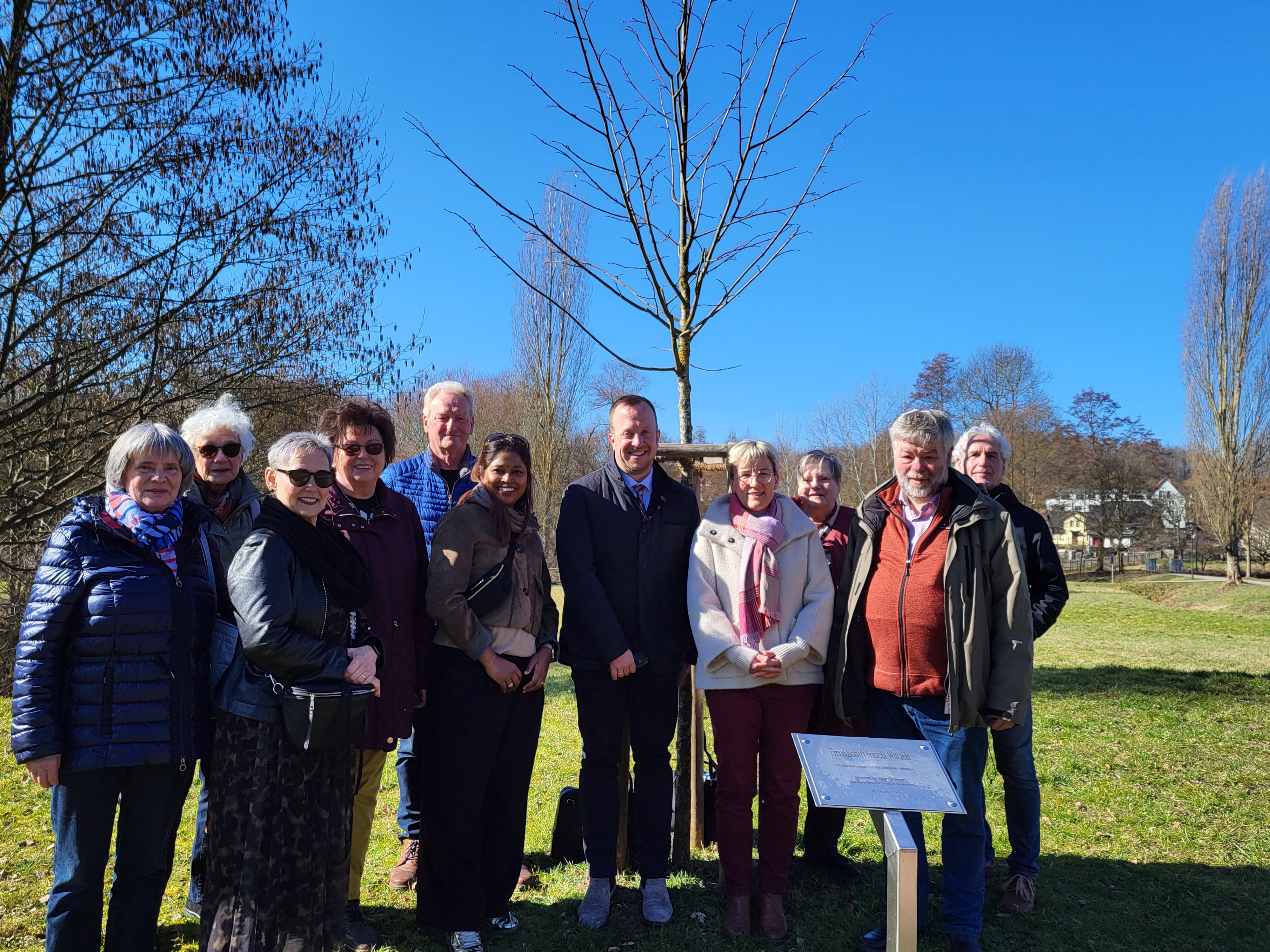 - Besuch des Freundschaftsbaums im Neuen Kurpark: v. l. Ursula Eberlein, Reinhild Vogt, Manuela Alter, Margit Bergmann-Müller, Bodo Burmeister, Sunita Schröder, Timo Riedemann, Susanne Rakowski, Cornelia Rönsch, Endrik Müller, Karlheinz Becker