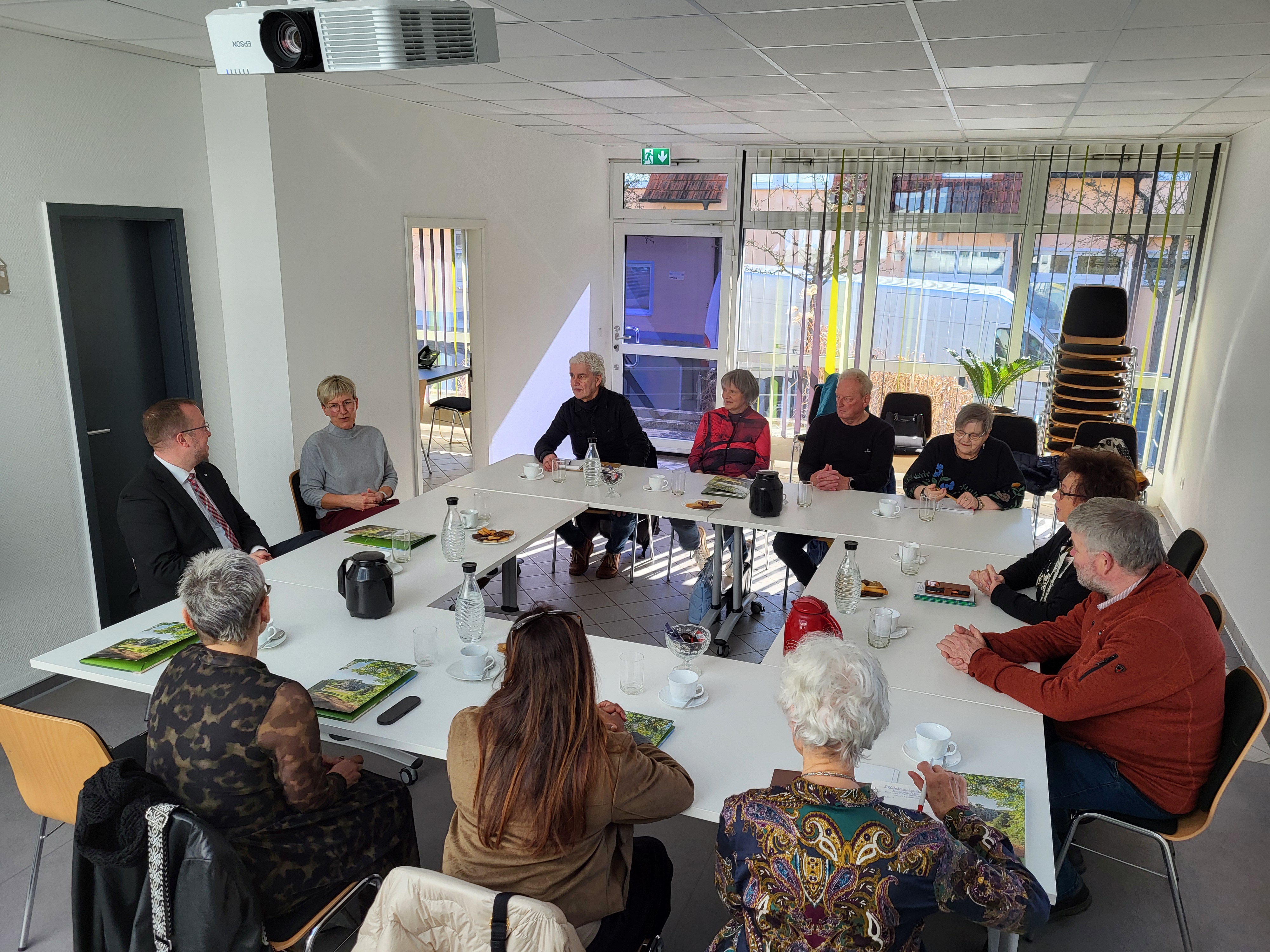 Vertreter der Städtepartnerschaftsvereine aus beiden Städten sowie die Bürgermeister trafen sich im Sitzungsraum der Dienststelle in der Bahnhofstraße 11 zum traditionellen Jahresgespräch. Dabei blickten die Teilnehmer zunächst auf die gemeinsamen Aktivitäten des vergangenen Jahres zurück. Dazu gehörten unter anderem Begegnungen von Karnevalsvereinen oder der gemeinsame Wandertag in Bad Liebenstein.