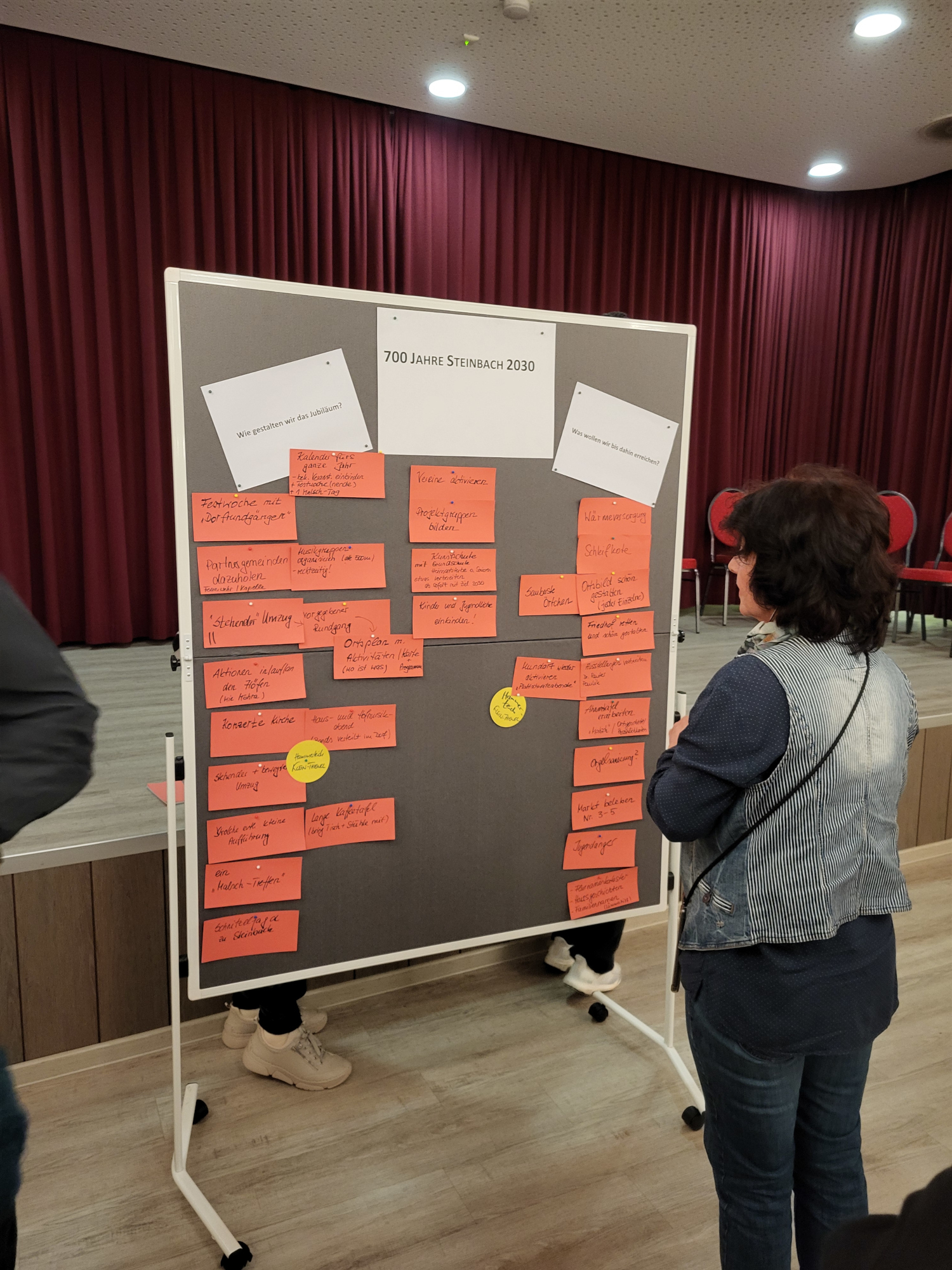 Im Anschluss sammelten die Teilnehmer erste Ideen für das Jahr 2030, wenn Steinbach sein 700-jähriges Bestehen feiern wird. Schnell entwickelte sich eine lebhafte Diskussion über mögliche Formate. Viele hielten einen großen Festumzug wie 2005 aus personellen und finanziellen Gründen für kaum umsetzbar. Stattdessen fand die Idee eines „stehenden Umzugs“ breite Zustimmung: Die Gäste könnten dabei durch den Ort gehen und an verschiedenen Stationen in Höfen, auf Plätzen und an Gebäuden Aktionen und Darbietungen erleben.