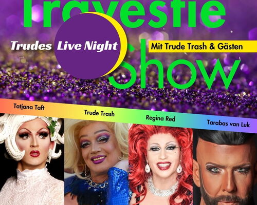 Doch Trude kommt nicht allein! Sie bringt drei ihrer besten Freundinnen mit:✨ Regina Red – die Comedy-Queen der Truppe, die mit ihren schmissigen Gassenhauern das Publikum zum Toben bringt.✨ Tatjana Taft – eine Diva mit einem unvergesslichen Stil, deren extravagante Kostüme echte Kunstwerke sind.✨ Tarabas van Luk – auch bekannt als Mister Swarovski! Mit seinen 2,15 Metern, einer gewaltigen Stimme von Oper bis Schlager und funkelnden, selbst gefertigten Strass-Kostümen ist er eine absolute Ausnahmeerscheinung.